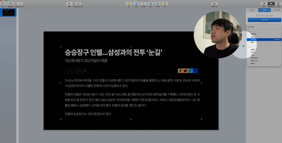 키노트의 훌륭한 애니메이션을 활용하면 딱딱한 슬라이드 설명 영상을 재미있는 영상으로 탈바꿈 시켜줄 수 있습니다.
