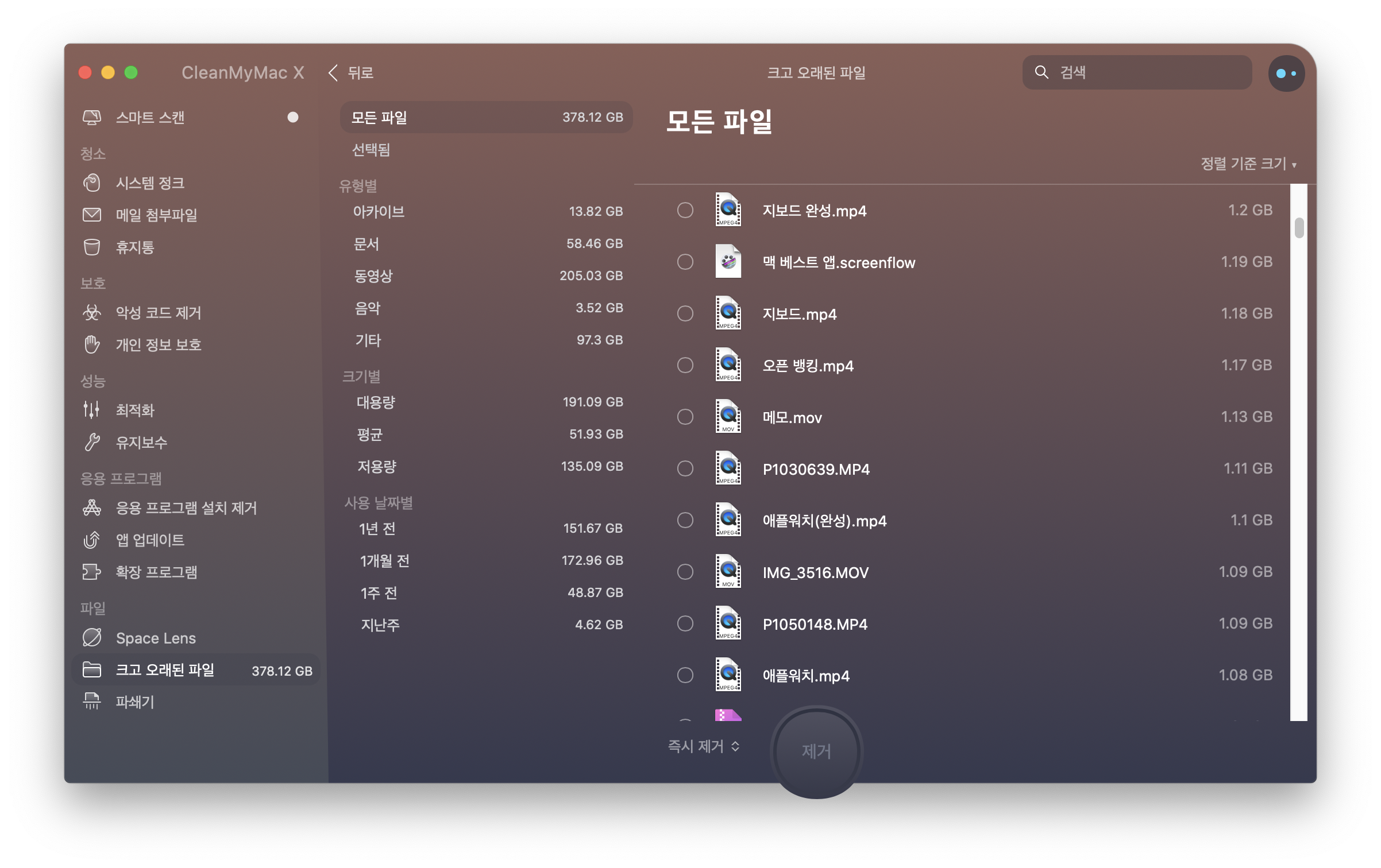 또한, 클린 마이 맥을 통해서 오랫동안 사용하지 않은 '크고 오래된 파일'을 찾아 삭제할 수 있습니다. 저도 얼마전에 이 기능을 돌려보고 20기가 정도의 용량을 확보할 수 있었습니다. 예전에 만들어놨던 이제는 사용하지 않는 파이널 컷 라이브러리를 찾아 삭제했기 때문입니다.