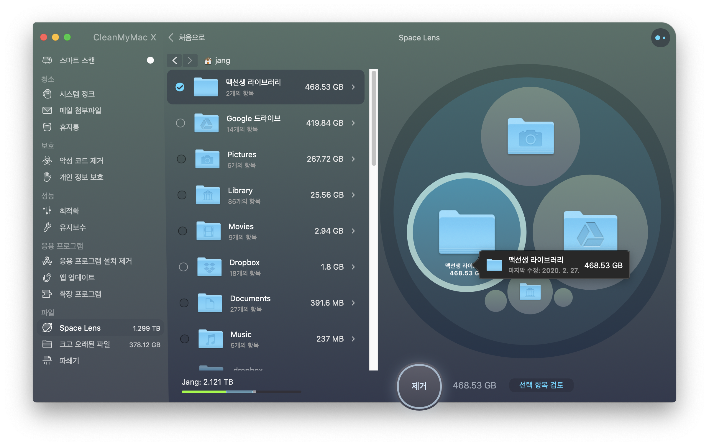 클린 마이 맥의 Space Lens를 활용하면 내 맥의 저장공간을 시각적으로 비교할 수 있습니다. 빠른 정리를 위해 폴더 및 파일에 대한 크기를 시각적으로 비교하는 것이죠. 저도 이 기능을 활용해서 내 맥의 어떤 폴더, 어떤 앱에서 용량을 많이 차지하는지 쉽고 빠르게 확인할 수 있었습니다.