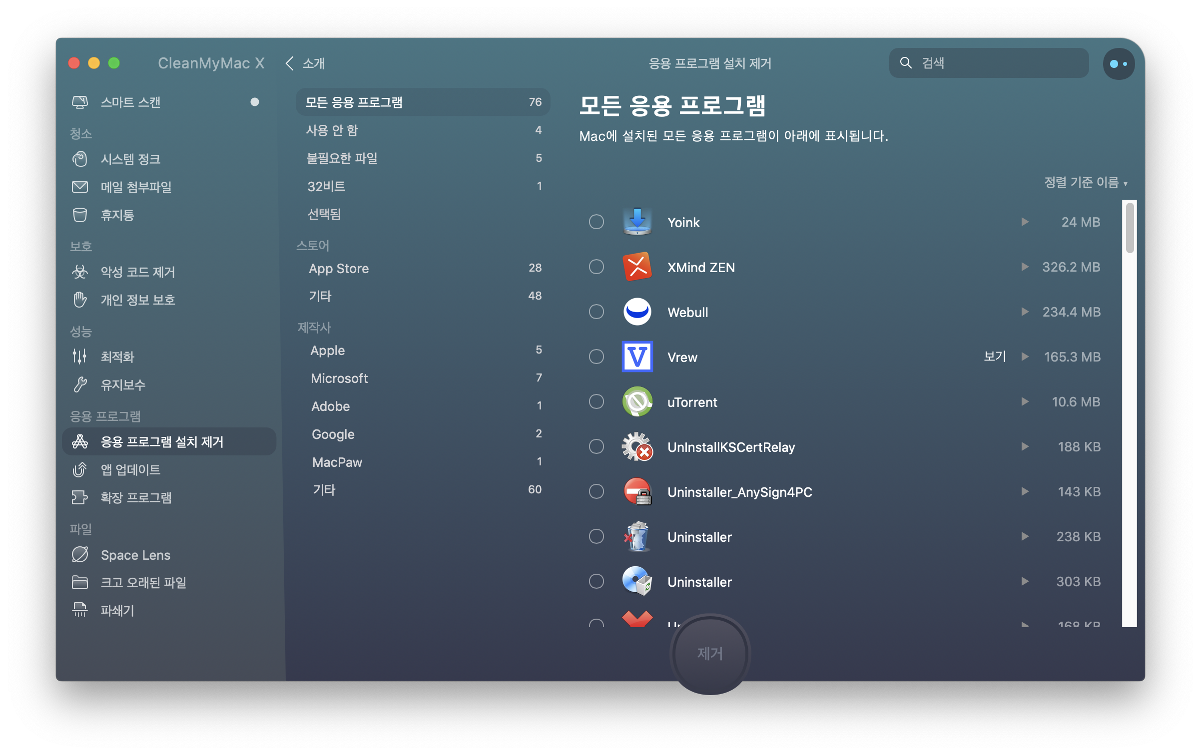 저는 앱을 삭제할 때 '파인더 > 응용프로그램'에서 앱을 찾아 삭제하는 것보다 클린 마이 맥으로 앱을 삭제하는 것을 추천드립니다. 그 이유는 '파인더 > 응용프로그램'에서 앱을 찾아 삭제를 하게 되면 앱이 만들어낸 여러 찌꺼기 파일들은 삭제가 되지 않기 때문입니다. 하지만 클린 마이 맥의 내장된 '응용 프로그램 설치 제거' 기능을 활용한다면 이런 찌꺼기 파일까지 삭제할 수 있습니다.