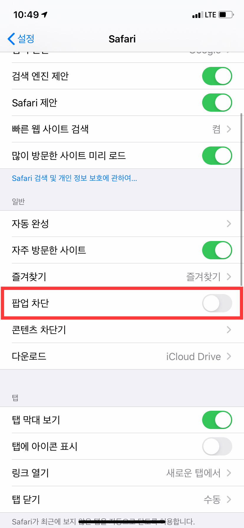 사파리 설정에서 아래로 이동을 해보면 '팝업 차단'이 있습니다. 여기에서 팝업 차단을 꺼주시면 됩니다.