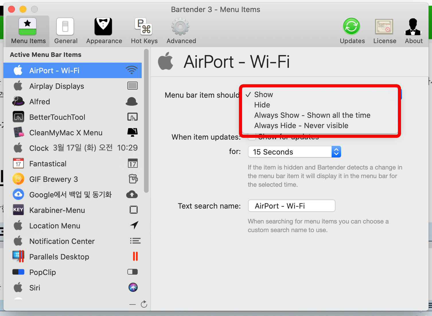 - Always Show/Hide: 어떤 일이 있어도 메뉴바에 보이거나/숨겨진 상태로 만들도록 합니다. 저는 이 2가지 옵션은 잘 사용하지 않습니다.