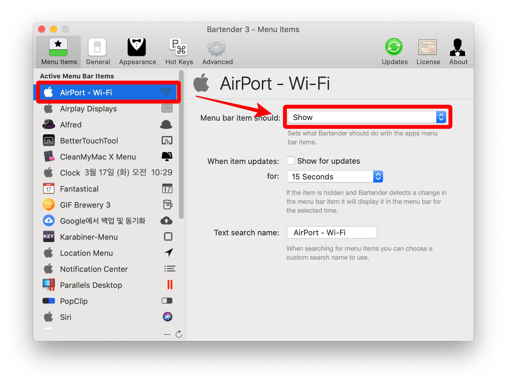 왼쪽 'Active Menu Bar Items'에서 숨기고 싶은 메뉴바 아이콘을 선택합니다. 오른쪽에 'Menu bar item should' 항목에 주목해주세요.