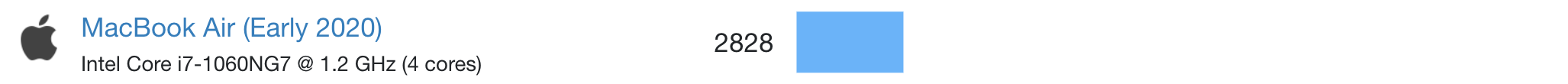 다음은 맥북에어, 맥북 프로 13형, 맥북 프로 16형의 성능을 비교한 벤치마크 지수입니다. 2020년 4월 말 기준에 출시된 여러 맥북 중 가장 성능이 좋은 맥북으로 비교를 해봤습니다. (출처: https://browser.geekbench.com/mac-benchmarks)