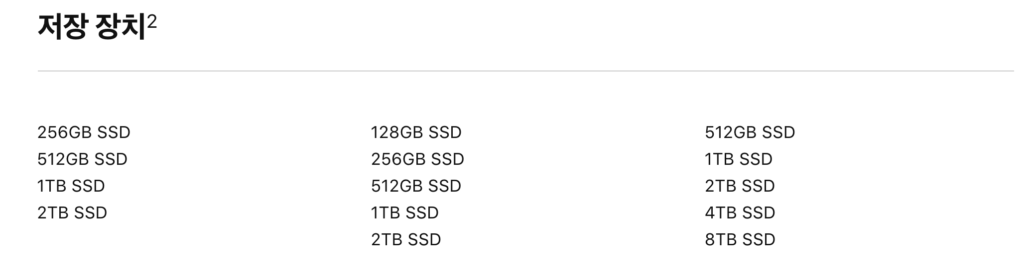 맥북의 저장장치는 다디익선입니다. 맥북에어는 256기가부터, 맥북 프로 13형은 128기가부터, 맥북 프로 16형은 512기가부터 고를 수 있습니다. 돈의 여유가 있는 선에서 최대치로 골라주는 것이 좋습니다. 단, 돈이 조금 모자란다고 해도 128기가는 선택하지 않는 것이 좋습니다. 128기가는 맥북에 몇 가지 앱만 설치해도 금방 차버립니다. 적어도 256기가를 선택하는 것이 좋습니다. 개인적으로는 256기가를 사용하고 있는데 256기가도 부족해서 외장 SSD를 달아서 사용 중입니다. 필요할 때마다 외장 SSD를 연결하는 것이 여간 귀찮은 일이 아닙니다.